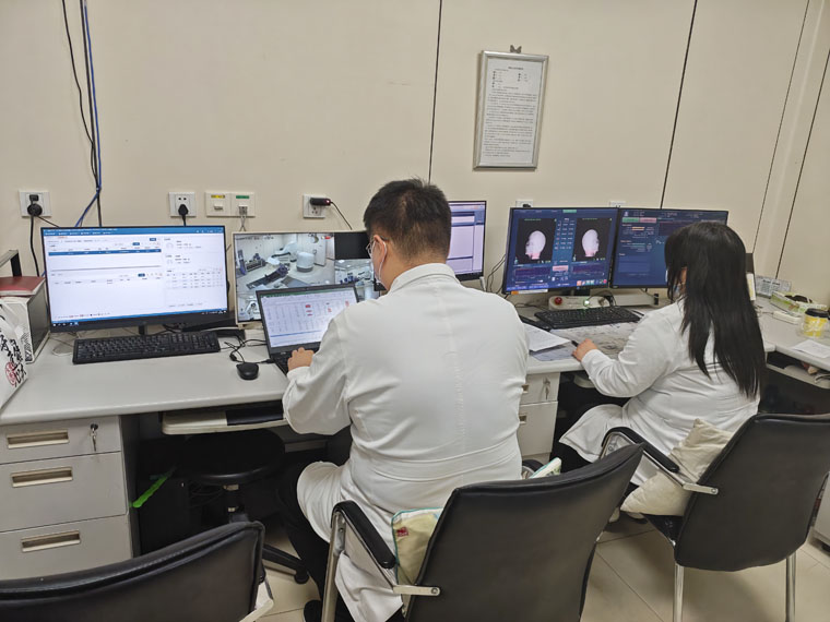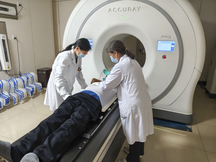 螺旋断层放射治疗加速器平稳运转,圆满完成多例疑难复杂病例的精准治疗。治疗前,团队严格通过CT扫描开展三维体位验证,确保实际体位与治疗计划精准匹配;治疗中,规范操作、精准摆位,在保障治疗精度的同时,充分兼顾患者舒适度,各项诊疗任务均高质量完成。